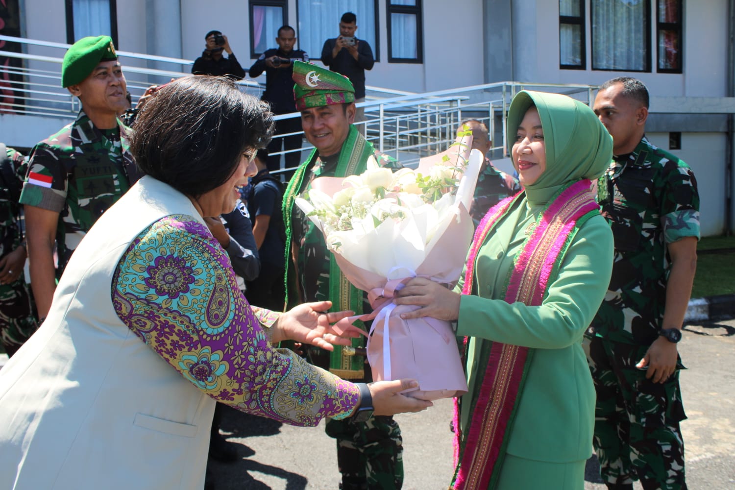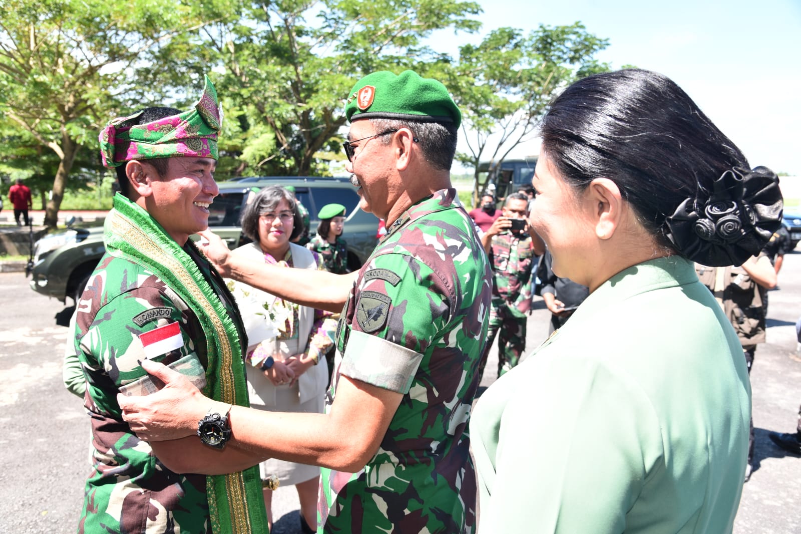 Setibanya Pangdam XII/Tpr disambut dengan pengalungan syal dan pemasangan tanjak oleh Kasdam XII/Tpr Brigjen TNI Yufti, S.E., M.M. Sedangkan Ketua Persit KCK Daerah XII/Tpr menerima Hand Bucket dari Wakil Ketua Yayasan Kartika Jaya Cabang XVII serta tarian selamat datang.