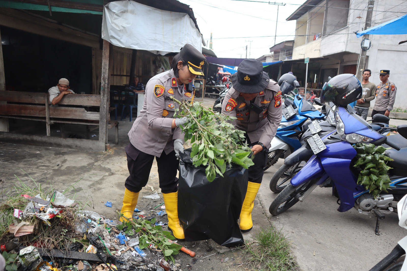 Kegiatan pembersihan sampah dan parit dilakukan Polres Dumai di 2 (dua) lokasi berbeda yakni Pasar Senggol Jalan Sultan Syarif Kasim dan Kampung Tangguh Anti Narkotika Jalan Kaswari Ujung.